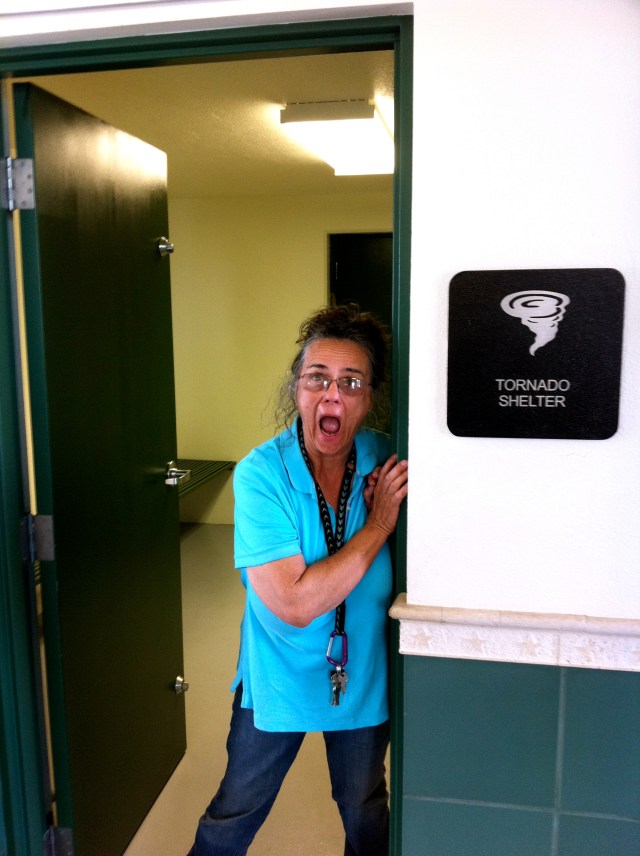 Between the restrooms was a small, interior room with no windows. It was prominently labeled with a sign which read, “Tornado Shelter.” Note Diana’s reaction in the photo at the bottom of this page.
