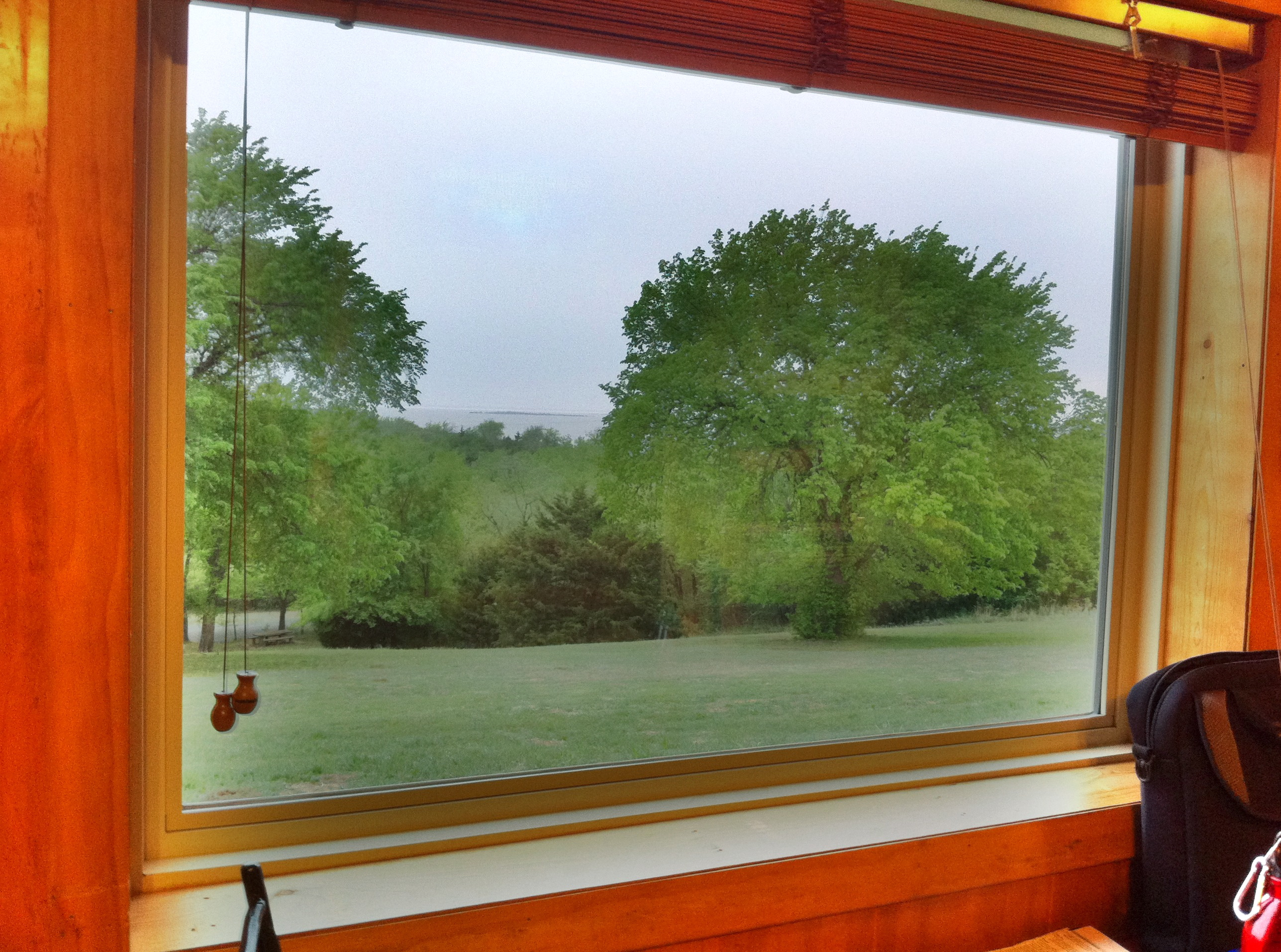 I must add here that yes, the cabin was rustic, but also contained a fully equipped bathroom and kitchen as well as a flat-screen HDTV with Dish Network. If I must “rough it,” THIS is the way I prefer! And check out the view from our cabin window (that’s the lake in the distance).
