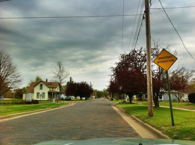 We drove around town, enjoying the variety of home styles and front yard treatments, stopped for a picture of the water tower, and as we were leaving we discovered a very dangerous place (see below).